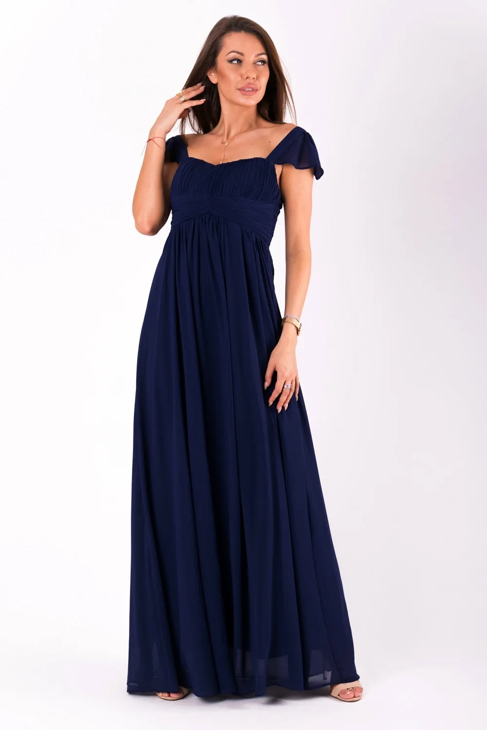 Dlouhé elegantní šaty bez ramínek s volánky. Vrchní část s ozdobnými záhyby, spodní část volná. V zadní části je všitá elastická látka, která v případě potřeby zvětší objem až o 10 cm. Skvěle se hodí pro mnoho příležitostí.