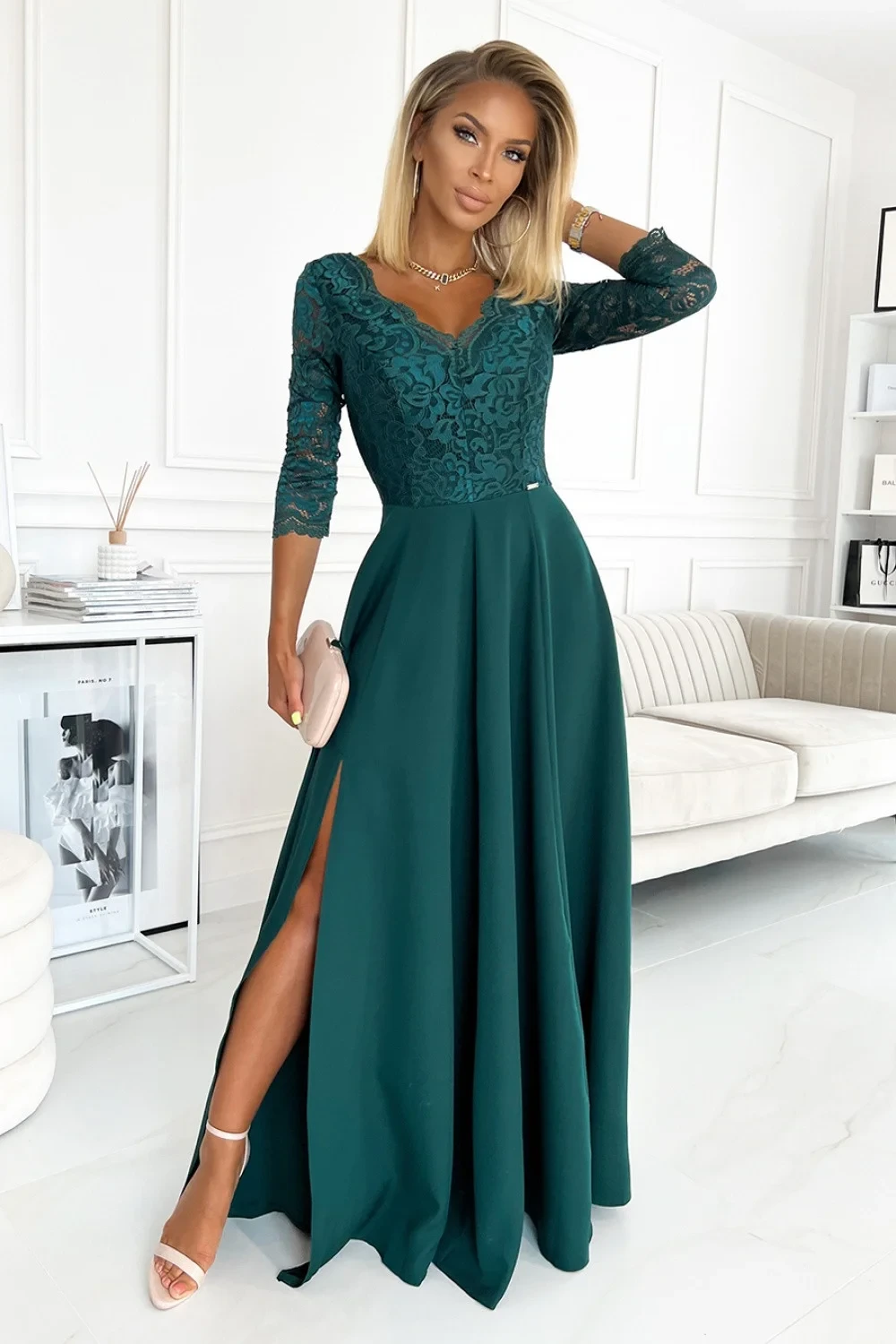 Elegantní dlouhé krajkové šaty se srdíčkovým výstřihem. Krásně tvarovaný výstřih a rozparek na sukni vytvářejí neobvyklou kreaci v lahvově zelené barvě. Polská produkce. Značka Numoco.