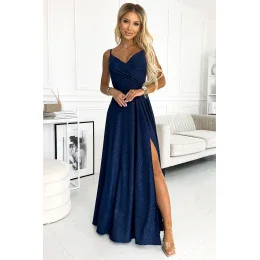 Elegantní maxi třpytivé šaty bez ramínek. Krásně tvarovaný výstřih a rozparek na sukni vytvářejí neobvyklou kompozici. Vyrobeno z brokátové elastické látky v tmavě modré barvě. Šaty ideální na svatbu, Silvestra, ples, karneval a další významnější příležitosti. Vyrobeno v Polsku. Značka Numoco.