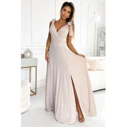 Maxi dlouhé šaty s výstřihem, rozparkem na nohou a mašlemi na ramenou. Jsou vyrobeny z materiálu příjemného na dotek v béžové barvě s brokátem. Polský výrobek. Značka numoco.
