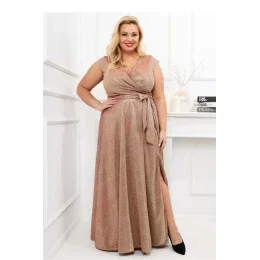 Elegantní, lesklé šaty v odstínu tmavého zlata jsou skvělou volbou na speciální příležitosti. Vyrobené z jemně třpytivého materiálu dodávají outfitu jemný lesk a luxusní vzhled. Klopový výstřih ve tvaru písmene V nádherně zdůrazňuje poprsí, zatímco vázání v pasu formuje postavu a zdůrazňuje její přednosti. Rozkročený spodek s efektním rozparkem dodává šatům lehkost a smyslnost. Model se zapíná na skrytý zip, co zajišťuje pohodlné nošení a dokonalé přizpůsobení postavě. Ideální na svatby, bály, recepce a jiné slavnostní události.