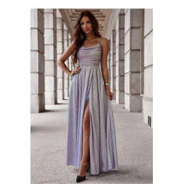 Elegantní a zároveň jednoduché dlouhé šaty s rozparkem dole, vyrobené z lesklé látky. Šaty se zapínají na skrytý zip. Přední část s výstřihem na vodu a tenkými ramínky, zadní část s provázkovým zapínáním. Skvělý návrh na mnoho příležitostí.