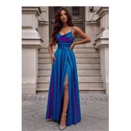 Elegantní a zároveň jednoduché dlouhé šaty s rozparkem dole, vyrobené z lesklé látky. Šaty se zapínají na skrytý zip. Přední část s výstřihem na vodu a tenkými ramínky, zadní část s provázkem. Skvělý návrh pro mnoho příležitostí.