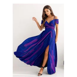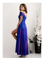 Elegantní dlouhé šaty s přesýpacím výstřihem, tenkými ramínky a rukávy. Šaty se zapínají v pase na skrytý zip, spodní část je rozkročená s rozparkem. Šaty jsou vyrobeny z lesklého materiálu.