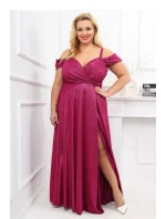 Elegantní dlouhé šaty s přesahovým výstřihem, tenkými ramínky a rukávy. Šaty se ořezávají v pasu a zapínají se na skrytý zip, spodní část je rozšířená s rozparkem. Šaty jsou vyrobeny z lesklého materiálu.