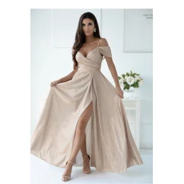 Elegantní dlouhé šaty s překrytým výstřihem, tenkými ramínky a rukávy. Šaty s pasem se zapínáním na skrytý zip, spodní část se rozšiřuje s rozparkem. Šaty jsou vyrobeny z lehkého lesklého materiálu.