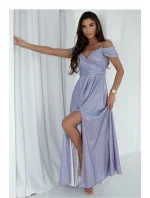 Elegantní dlouhé šaty s překrytým výstřihem, tenkými ramínky a rukávy. Šaty se zapínají v pasu na skrytý zip, spodek je rozkročený s rozparkem. Šaty jsou vyrobeny z lesklého materiálu.