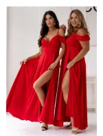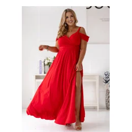 Elegantní dlouhé šaty s přesýpacím výstřihem, tenkými ramínky a rukávy. Šaty se oděvají v pasu na skrytý zip, dolní část je rozkročená s rozparkem. Šaty jsou vyrobeny z hladkého pružného materiálu.