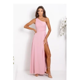 Dlouhé rovné šaty s asymetrickými ramínky, jedno tenké, druhé tlustší. Šaty se přepínají v pasu, spodek je rozkvetlý. Šaty se zapínají na skrytý zip na boku. Na zádech ozdobné prořezání s pleteným vázáním.