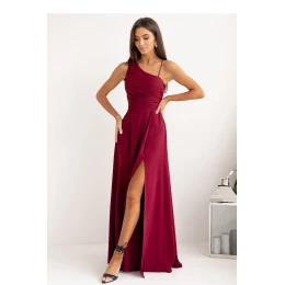 Dlouhé rovné šaty s asymetrickými ramínky, jedno tenké, druhé tlustší. Šaty se odřezávají v pasu, spodek je rozkročený. Šaty se zapínají na skrytý zip po straně. Na zádech ozdobné rozříznutí s pleteným uvazováním.