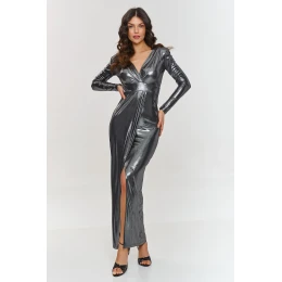 Maxi šaty z kovového materiálu jsou elegantní kreace, která září a půvabem. Překládaný výstřih do šípu je jemný, ale efektní detail, který zdůrazňuje krk a ramena, zároveň dodává eleganci a smyslnost celku. Tento střih výstřihu dělá šaty vypadat sofistikovaněji a zdůrazňuje přirozené tvary postavy. Dlouhé, úzké rukávy v kombinaci s celými šaty tvoří elegantní a souvislý celek. Model má jemný rozpark na boku, který ji dodává smyslnost a lehkost celému stylu. Díky tomu je nejen elegantní, ale také velmi ženská a pohodlná na nošení. Šaty jsou navrženy ve stísněném střihu, který zdůrazňuje pas a přirozeně modeluje postavu, vytvářejíc efekt štíhlé figury. Díky elegantnímu, lesklému materiálu a klasickému střihu se kreace skvěle hodí na večerní výlety, oslavy, svatby nebo bankety. Jedná se o nadčasovou volbu, která vám zajistí stylový vzhled v každé situaci. Tyto elegantní šaty jsou skvělé na výjimečné příležitosti, které vyžadují eleganci a třídu. Kombinujte je s vysokými podpatky a šperky, abyste vytvořili efektní stylizaci, ve které sami sebe očarujete a přitáhnete pozornost ostatních.