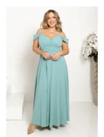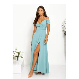 Elegantní dlouhé šaty s překrytým výstřihem, tenkými ramínky a rukávy. Šaty s pasem a skrytým zipem, spodek rozšířený s rozparkem. Šaty vyrobené z hladkého padavého materiálu.