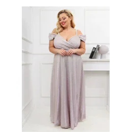 Elegantní dlouhé šaty s přesýpacím výstřihem, tenkými ramínky a rukávy. Šaty se odřezávají v pasu a zapínají se na skrytý zip, spodní díl je rozkvetlý s rozparem. Šaty jsou vyrobeny z lesklého materiálu.