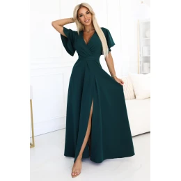 Šaty Jennifer od značky Numoco spojují eleganci a pohodlí v jednom. Maxi model s efektním záhybovým výstřihem krásně zdůrazňuje poprsí a zúží siluetu, zatímco široké, volné rukávy dodávají kreaci lehkost. Vysoké rozparky na noze přidávají smyslný charakter a zdůrazňují ženský půvab. Vyrobené z vysoké kvality materiálu, šaty se dokonale přizpůsobí tělu a zajistí pohodlí během večerních událostí. Hluboká zelená barva dodává šatům nadčasový styl, který se hodí na svatbu, ples, Silvestra, banket, galavečer nebo romantickou večeři.