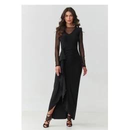 Tato jedinečná černá maxi šaty jsou kvintesencí elegance a ženskosti. Jejich délka až na zem zajišťuje, že vypadají velmi důstojně a skvěle vypadají při večerních akcích, přidávají postavě štíhlost a lehkost. Výstřih ve formě jemného písmene V, obklopený jemným tylem, krásně zdůrazňuje krk a klíční kosti, zůstávaje přitom plný elegance. Jedná se o detail, který přitahuje pohledy a zároveň zůstává smyslný a elegantní. Vhodný střih krásně zdůrazňuje pas. Efektní volán podél sukne dodává kreaci dynamiku a jedinečný charakter, a rozpark na přední straně jemně odhaluje nohu, činíce každý krok plným elegance. Model má dlouhé rukávy vyrobené z tylu, který zdůrazňuje lehkost a tajemnost celého stylu. Šaty se zapínají na zip vzadu, což usnadňuje oblékání a zajišťuje ideální přizpůsobení a pohodlí při nošení. Jedná se o kreaci vytvořenou pro zvláštní příležitosti - svatbu, ples, maturitní ples nebo elegantní večeři, kde chcete působit sebejistě a okouzlujícě. Tyl: 100% polyester.