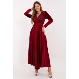 Úchvatné a elegantní dlouhé maxi šaty, které kombinují ženský střih s efektními detaily, ideální na slavnostní události a večírky. Vyrobena z lehké směsi viskózy a polyesteru, krásně padne na postavě, poskytující pohodlí a lehkost nošení. Model má přesahující výstřih, dlouhý rukáv a odříznutí pod prsy, které jemně zdůrazňuje pas. Vestavěné podprsenky poskytují podporu a krásně tvarují horní část postavy. Rozkvetlý, plisovaný spodek dodává šatům lehkost a efektní pohyb s každým krokem. Horní část šatů je zdobená flitry na přední straně, které přinášejí zář a eleganci, a vázání vzadu ve formě stuhy umožňuje přizpůsobit šaty postavě a zdůraznit pas. Šaty nemají klasické zapínání, oblékají se přes hlavu, což zdůrazňuje jejich volný, lehký charakter. Je to nabídka pro ženy, které oceňují eleganci, efektní detaily a pohodlí nošení, ideální na večerní výstupy, večírky a speciální příležitosti.