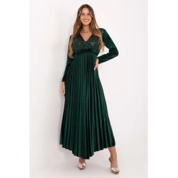 Úžasný a elegantní dlouhý maxi šaty, které spojují ženský střih s efektními detaily, ideální na slavnostní příležitosti a večírky. Vyrobené z lehké směsi viskózy a polyesteru, krásně padnou na postavu, poskytují pohodlí a lehkost nošení. Model má přesýpací výstřih, dlouhý rukáv a pas pod prsy, což decentně zdůrazňuje pas. Vložené košíčky dodávají podporu a krásně tvarují horní část postavy. Rozkročený, plisé dolní část šatů dodává lehkost a efektní pohyb s každým krokem. Horní část šatů je zdobena flitry na přední straně, které přinášejí lesk a eleganci, a šněrování na zadní straně ve formě mašle umožňuje přizpůsobit šaty postavě a zdůraznit pas. Šaty nemají klasické zapínání, jsou nasazovány přes hlavu, což zdůrazňuje jejich volný, lehký charakter. Toto je nabídka pro ženy, které oceňují eleganci, efektní detaily a pohodlí nošení, ideální na večerní vycházky, večírky a speciální příležitosti.