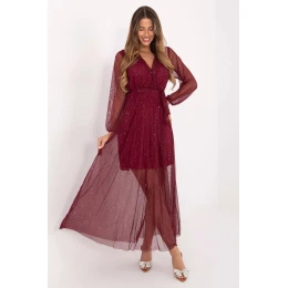 Oslnující šaty elegantního rozkroku, které se skvěle hodí na speciální příležitosti, oslavy nebo večerní vycházky. Vyrobena z vysoce kvalitního polyesteru s přídavkem elastanu, krásně padne na postavě, zároveň poskytuje pohodlí a volnost pohybu. Tkanina s lesklými prvky jemně třpytí ve světle, dávají kreaci výjimečný, reprezentativní charakter. Záhybový výstřih něžně zdůrazňuje dekolt a krk, a šněrování v pasu zdůrazňuje pas a dodává ženskou grácii. Dlouhý rukáv a podšívka zajišťují pohodlí a elegantní dokončení. Maxi délka dodává šatům eleganci a dělá je nesmírně efektními při každém pohybu. Tento model je určen pro ženy, které chtějí spojit klasickou eleganci s jemným leskem.