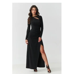 Oslavte všechny jedinečným vzhledem! Tato černá maxi šaty z elastického materiálu jsou ideální kombinací elegance a modernosti. Přizpůsobený střih krásně zdůrazňuje postavu a asymetrické rozříznutí na noze přidává nádech ženské elegance a sexapilu. Jemné výstřihy u dekoltu a dlouhé rukávy dělají z tohoto modelu ideální volbu pro elegantní večírky, plesy nebo romantické večeře. Šaty vyrobené z vysoce kvalitního materiálu nejsou jen efektní, ale také velmi pohodlné, lehce elastické, měkké a odolné proti vráskám. vsaďte na klasiku a ženskost v nejlepším provedení!