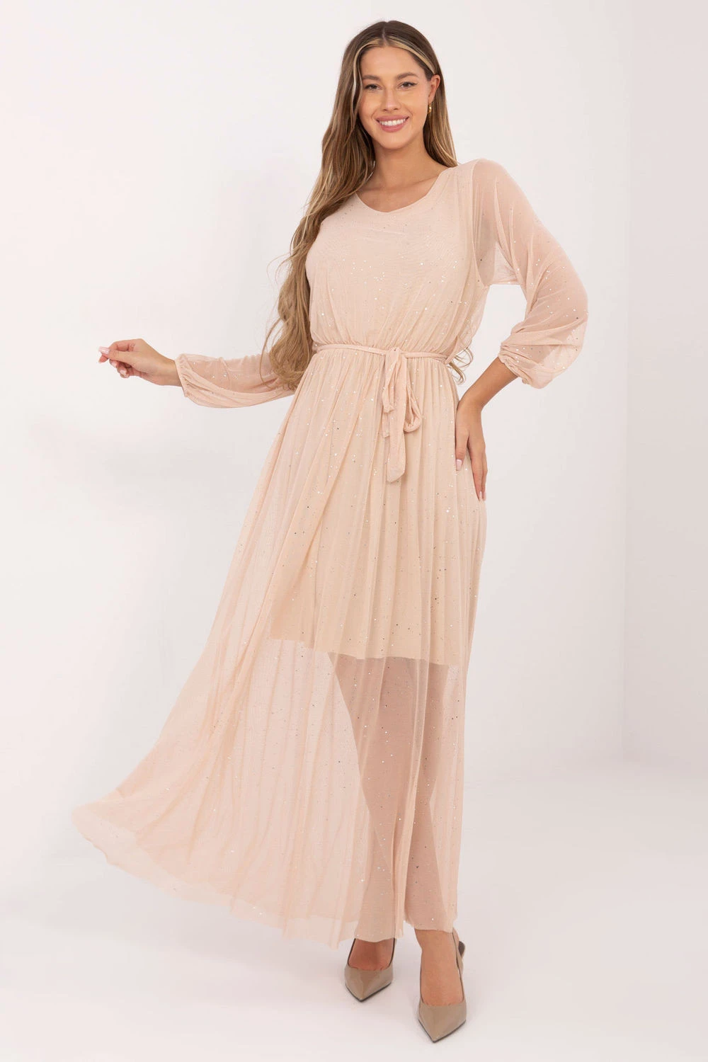 Elegantní maxi šaty z síťoviny jsou jedinečnou nabídkou na společenské události, ideální pro ženy, které oceňují decentní lesk a lehkost. Vyrobené z polyesteru a viskózy, působí efektně a zároveň zajistí pohodlí díky jemné podšívce. Model s rozkročeným střihem se krásně usadí během pohybu, vytvářejíc ženskou a vzdušnou siluetu. V pasu je vsazena gumová vložka a pásek k uvázání, který zdůrazní pas a umožní přizpůsobit střih dle vlastních preferencí. Dlouhý rukáv z jemné síťoviny, kulatý výstřih a lesklé prvky na materiálu dodávají šatům elegantní a večerní charakter. Maxi délka dále zdůrazňuje jejich elegantní styl. Stylové, ženské a neobyčejně efektní, ideální na večírky, slavnostní události a speciální výjezdy.