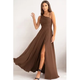 Dlouhé rovné šaty s asymetrickými ramínky, jedno tenké, druhé tlustší. Šaty s pasem, spodek rozšířený. Šaty se zapínají na skrytý zip na boku. Na zádech ozdobné rozříznutí s provázaným uzlíkem.