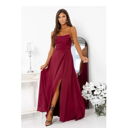 Dlouhé šaty vyrobené z hladkého, lesklého materiálu. Model s připevněnými ramínky, jemně zaškrceným vrchním dílem a efektním, vysokým rozparkem na noze. Zadní část je zakončena nastavitelnou, korzetovou šněrovací, která dokonale přizpůsobuje šaty postavě, dodatečný zip je zakrytý po stranách. Rozkročený spodek se krásně skládá při pohybu, vytvářejíc lehký, elegantní efekt. Ideální na maturitní ples, Silvestr a jiné speciální příležitosti.