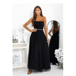 Oslnivající, tylové, dlouhé večerní šaty bez ramínek, vytvořené s ohledem na výjimečné příležitosti. Horní část šatů je zdobená jemným pásem třpytivých flitrů, které krásně zdůrazňují pas a přidávají kreaci eleganci. Model má efektní rozříznutí na noze, které dodává celku lehkost a smyslný charakter. Na zádech šatů je stylová šňůrka na zádech, díky kterému ji dokonale přizpůsobíte své postavě. Dalším usnadněním při oblékání šatů je zakrytý zip na levém boku. Součástí jsou také dodatečné ramínka k připevnění, což umožňuje nosit je dvěma způsoby, buď klasicky nebo s jemným podpětím ramen. Šaty NOEMI jsou skvělou volbou na plesy, svatby, maturitní plesy nebo elegantní večírky. Nastavitelná velikost prsou a pasu (gumový pásek pod šňůrou).