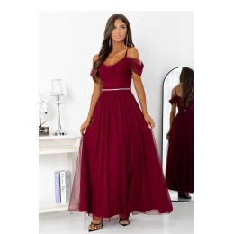 Tmavě červené večerní šaty s rozparkem a odkrytými rameny jsou kvintesencí elegance a ženskosti. Vyrobené z lehkého, vzdušného materiálu se krásně přizpůsobují postavě, zdůrazňují pas a zúžují siluetu. Model má jemně padající ramínka typu off shoulder, která jemně vystavují ramena a výstřih. Hluboký rozpark na noze dodává kreaci smyslný charakter, a přiléhavý korzet a tenký lesklý pásek dodávají celku jedinečný šarm. Zvláštní ozdobou těchto šatů je dekorativní pásek se zapínáním na knoflíky, který efektně zdůrazňuje pas. Pásek je zdobený lesklými detaily, díky čemuž přidává kreaci výjimečný, šperkový akcent a přitahuje pozornost jemným zábleskem. Tyto tmavě červené dlouhé šaty z tylu se skvěle hodí na svatbu, ples, maturitní ples, Silvestra nebo jinou elegantní akci. Kombinujte je se štíhlými podpatky a jemnými šperky, abyste vytvořili nadčasový, ženský outfit.