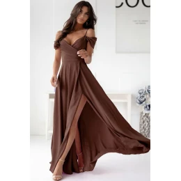 Elegantní dlouhé šaty s překrytým výstřihem, tenkými ramínky a rukávy. Šaty se spodní částí s rozparkem a zapínáním na skrytý zip v pasu. Šaty jsou vyrobeny z lehkého hladkého materiálu.