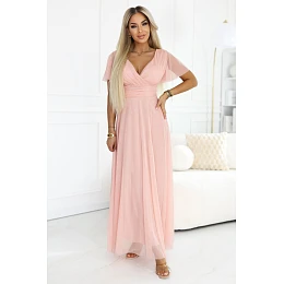 Tato broskvová maxi šaty s jemným leskem působí wau efekt hned od první chvíle - zeštíhluje postavu, zdůrazňuje pas a krásně se pohybuje. Zavinový V výstřih dodává lehkost horní části a lehké rukávy jemně padají na ramena. Ideální, když chcete vypadat elegantně a zároveň se cítit pohodlně po celý den a večer. Broskvové tylové maxi šaty s zavinovým výstřihem a decentním broskvovým leskem krásně zdůrazňují pas a okouzlují lehkostí pohybu. Skvělé na svatbu, ples, maturitní ples a elegantní večírky.