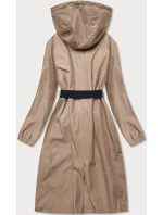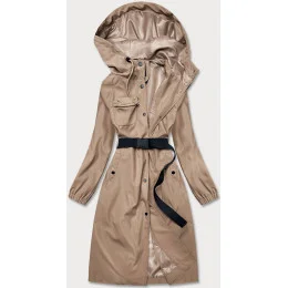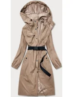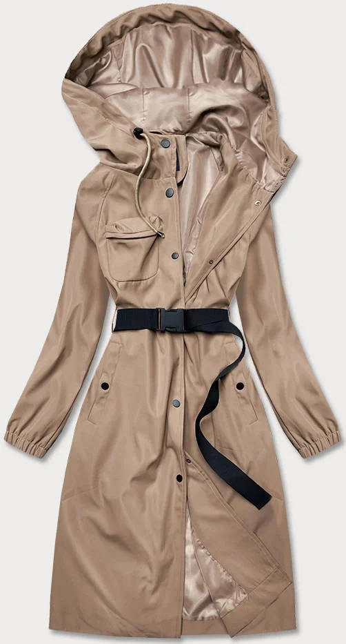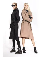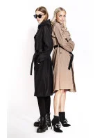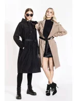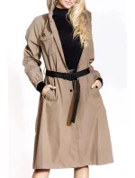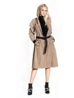 Kabát má podšívku, tři kapsy a zapíná se patentkami. Model má pásek s přezkou. Kabát má délku ke kolenům.