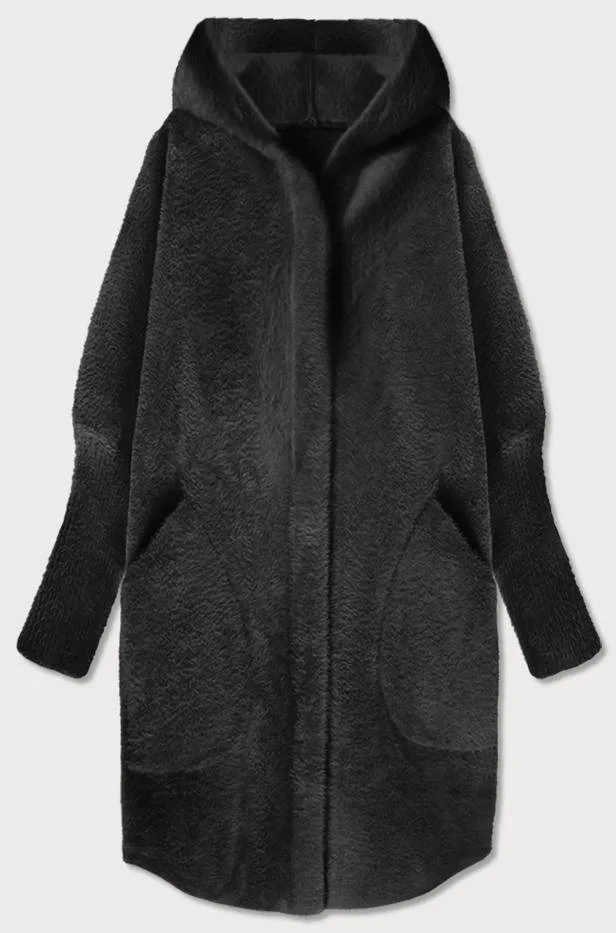 Dlouhý černý vlněný přehoz přes oblečení typu "alpaka" s kapucí (908)