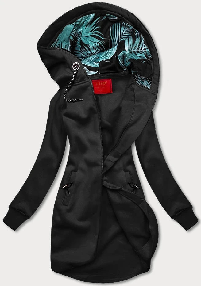Mikina je vypasovaná, uvnitř má příjemný polar (fleece), má dvě kapsy a zapíná se zipem. Rukávy jsou olemované stahovacími lemy. Spodní část modelu je asymetrická. Model má vzadu délku nad kolena.