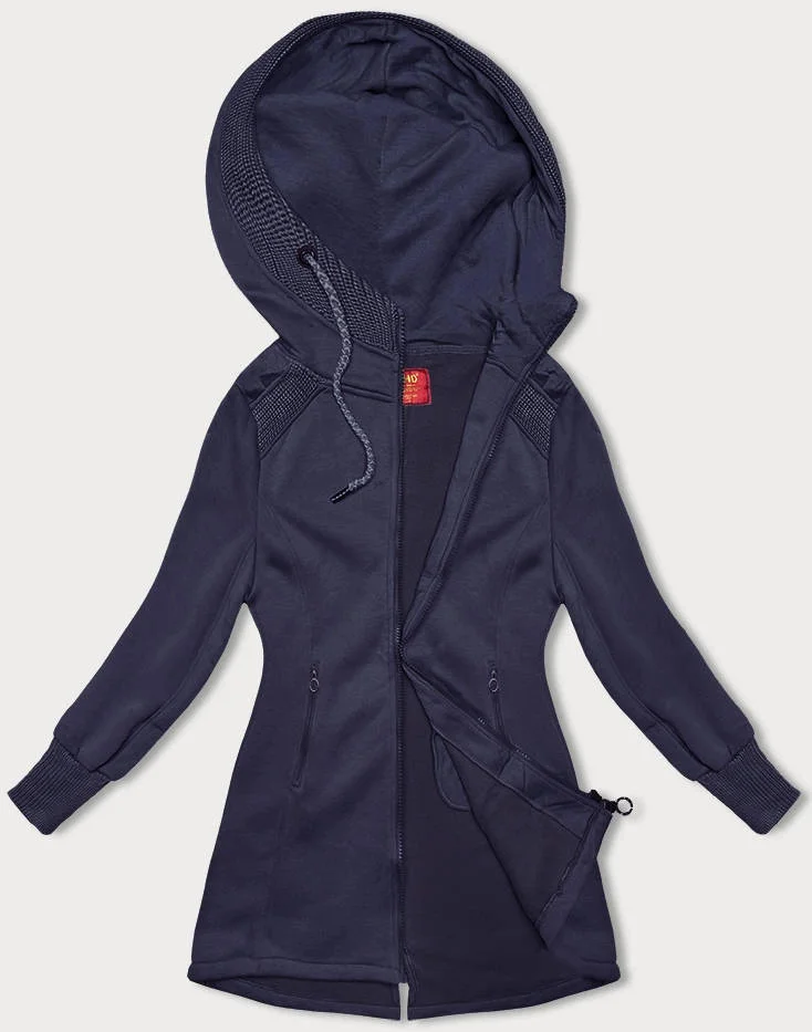 Mikina je lehce vypasovaná, uvnitř má příjemný polar (fleece), má dvě kapsy a zapíná se zipem. Na rukávech jsou stahovací lemy. Model má délku do poloviny stehen.