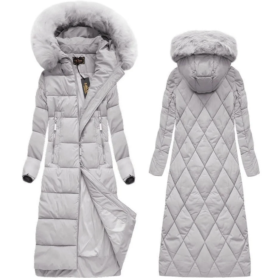Šedá dlouhá dámská zimní bunda s kapucí (7688BIG)
