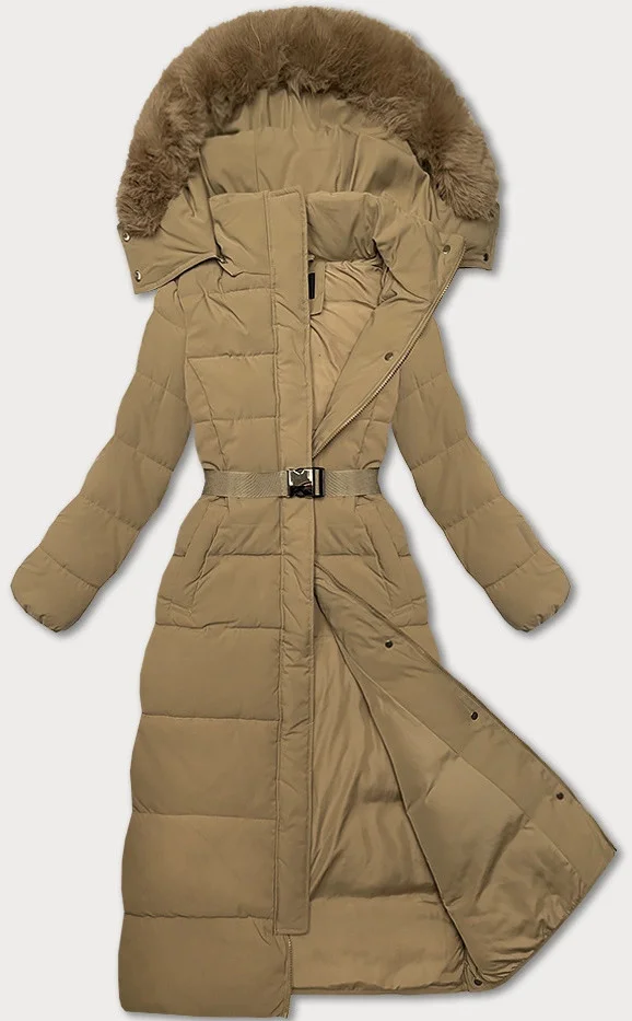 Dlouhá béžová hrubší bunda-kabát s opaskem (WD202306)