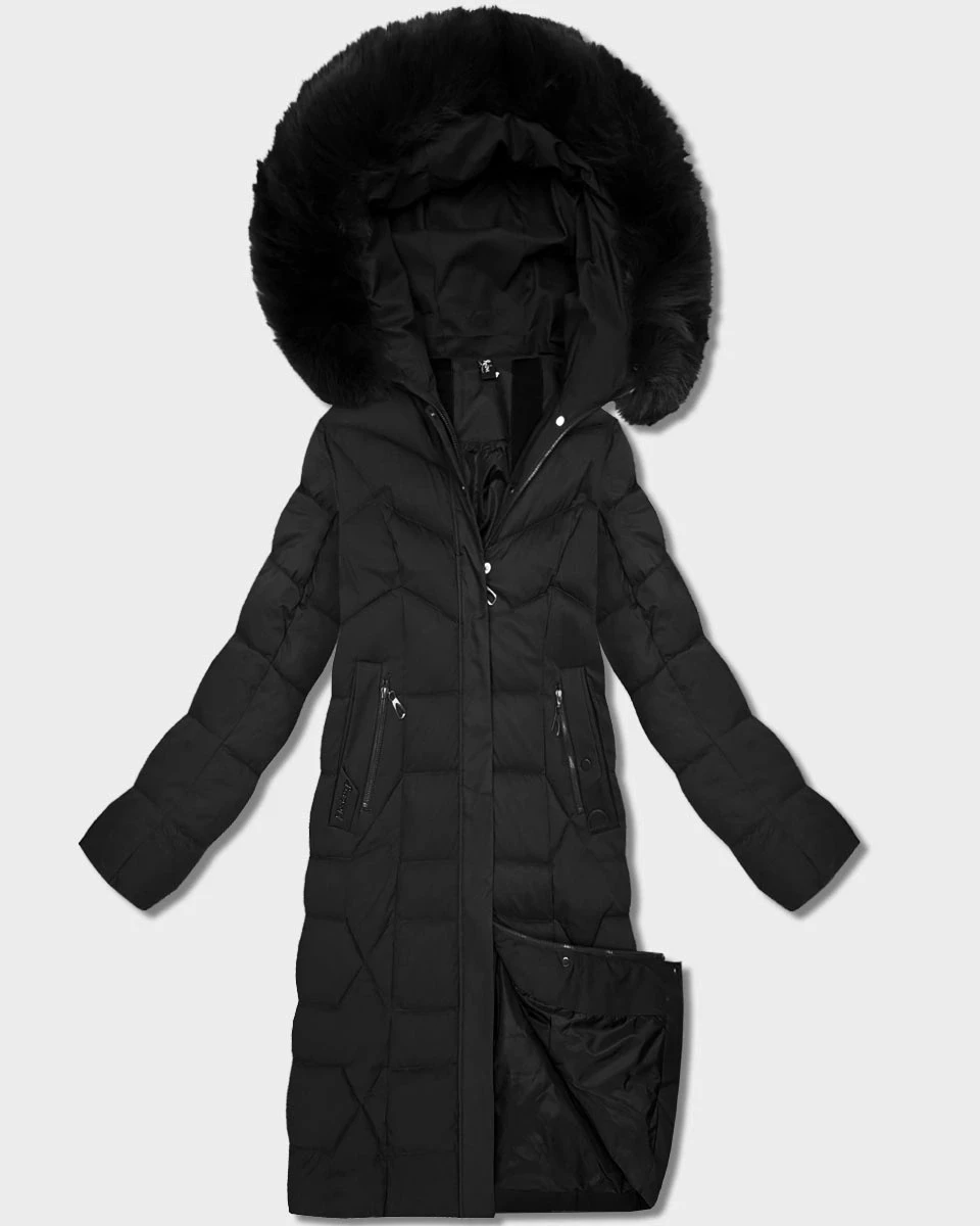 Dlouhá černá dámská bunda s kapucí (7665#-F06)