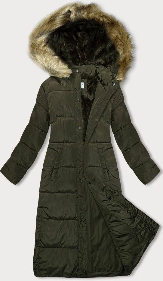 Dlouhá dámská zimní bunda v khaki barvě (V725)