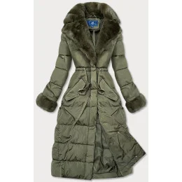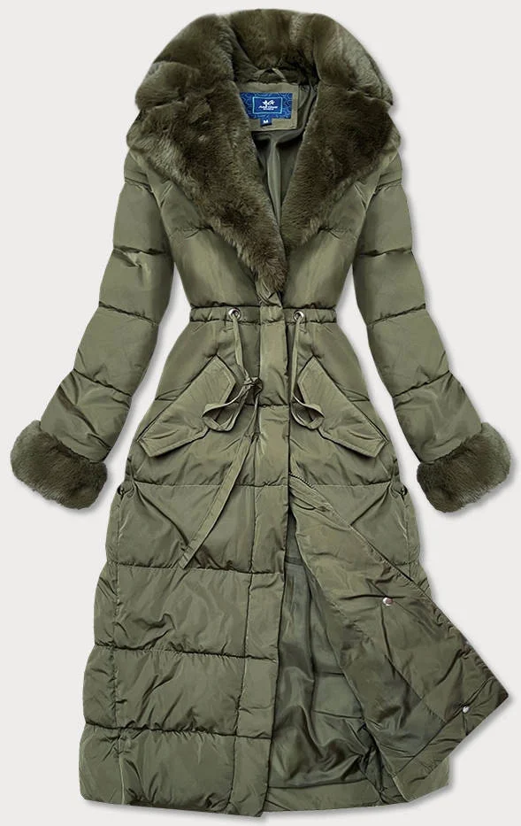 Dlouhá zimní bunda v barvě khaki s kožešinovým límcem (j9-071)