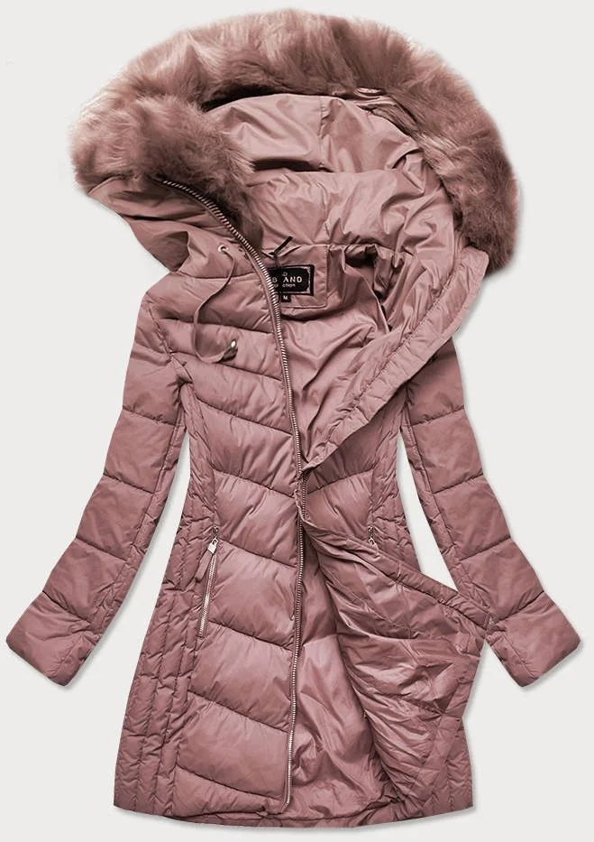 Dlouhá dámská prošívaná zimní bunda ve starorůžové barvě (7689)