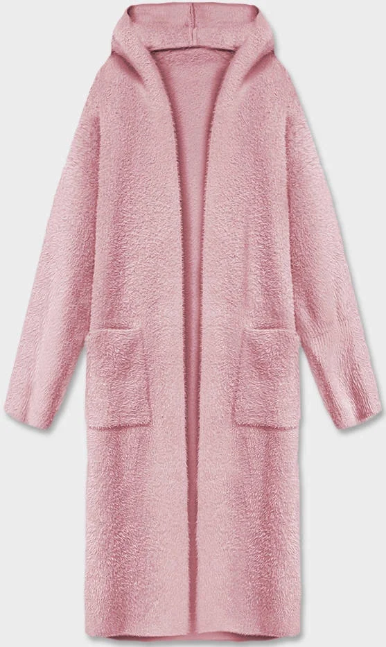 Dlouhý vlněný přehoz přes oblečení typu alpaka v bledě růžové barvě s kapucí (M105-1)