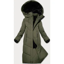 Dlouhá dámská zimní bunda v olivové barvě s kožešinovou podšívkou LHD (LHD-24571)