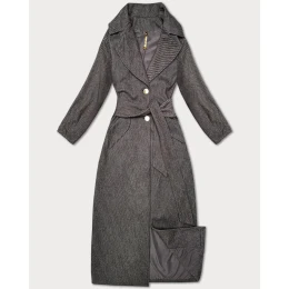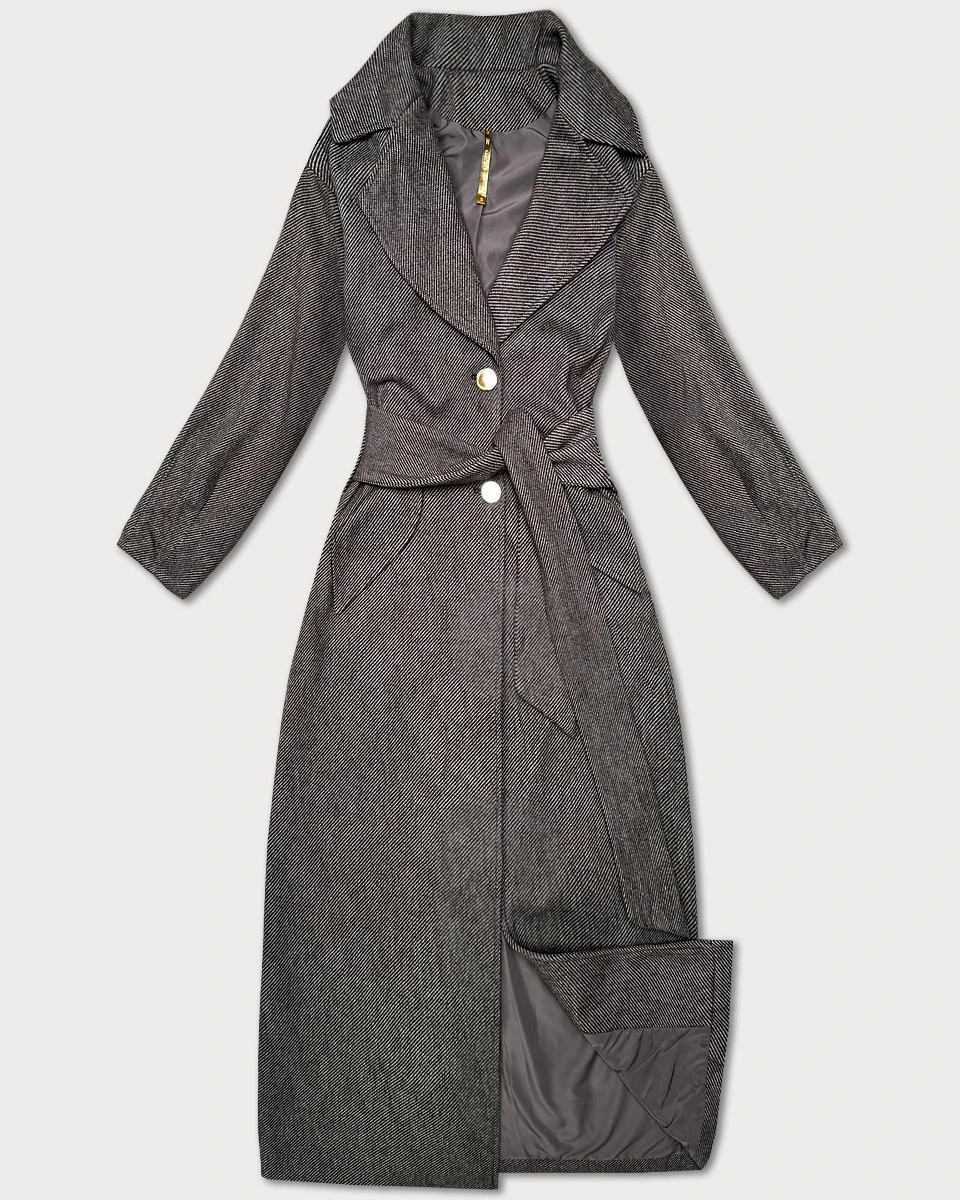 Hnědý pruhovaný dlouhý dámský kabát s páskem S'West (B8542-14)
