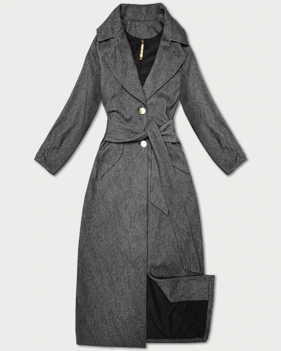 Černý pruhovaný dlouhý dámský kabát s páskem S'West (B8542-1)