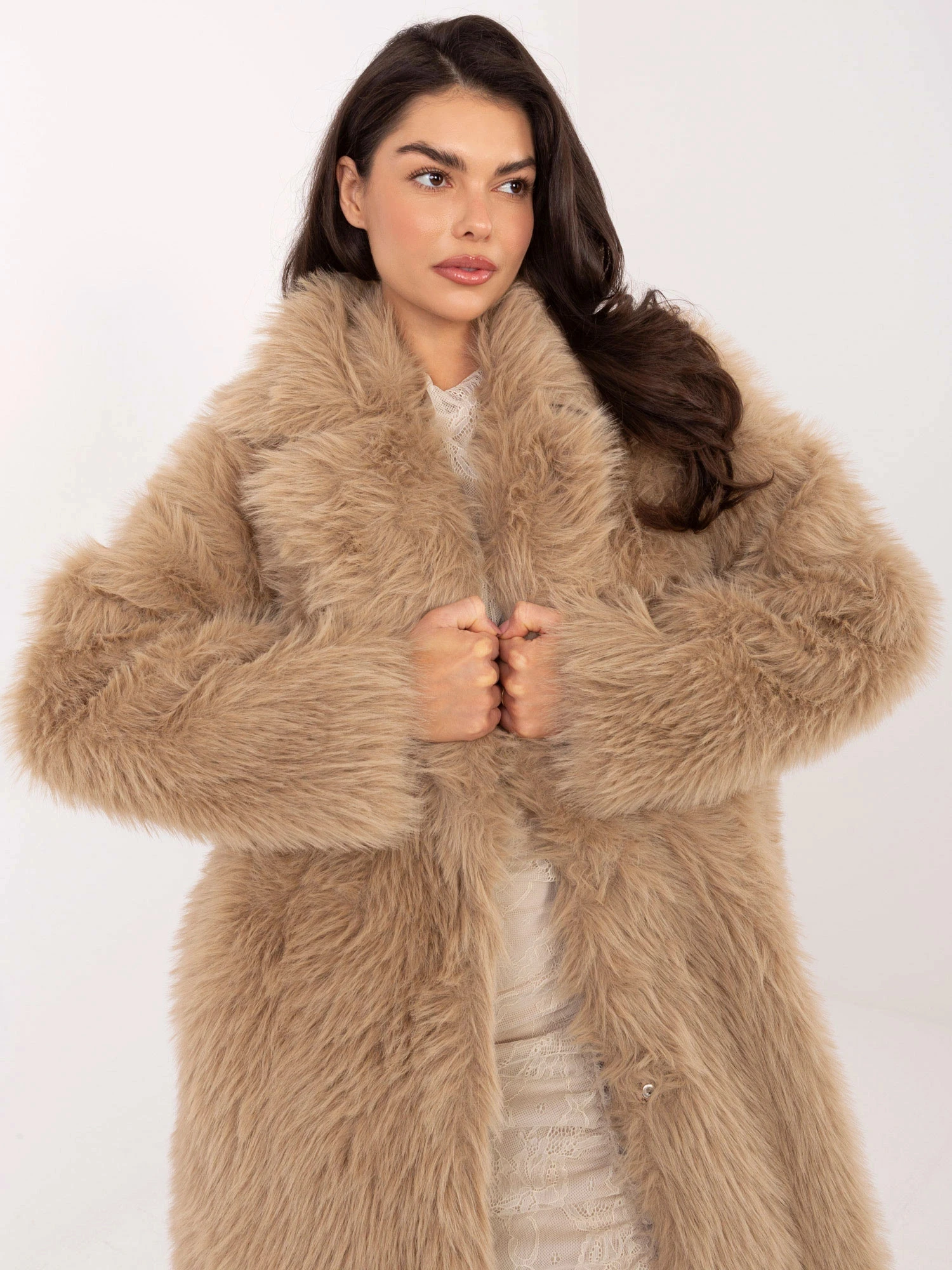 Tmavě béžový dlouhý dámský kabát z umělé kožešiny Goodlookin (G230132)