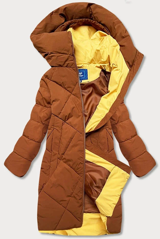 Delší dámská zimní bunda v karamelové barvě s vysokým stojáčkem (j9-067)