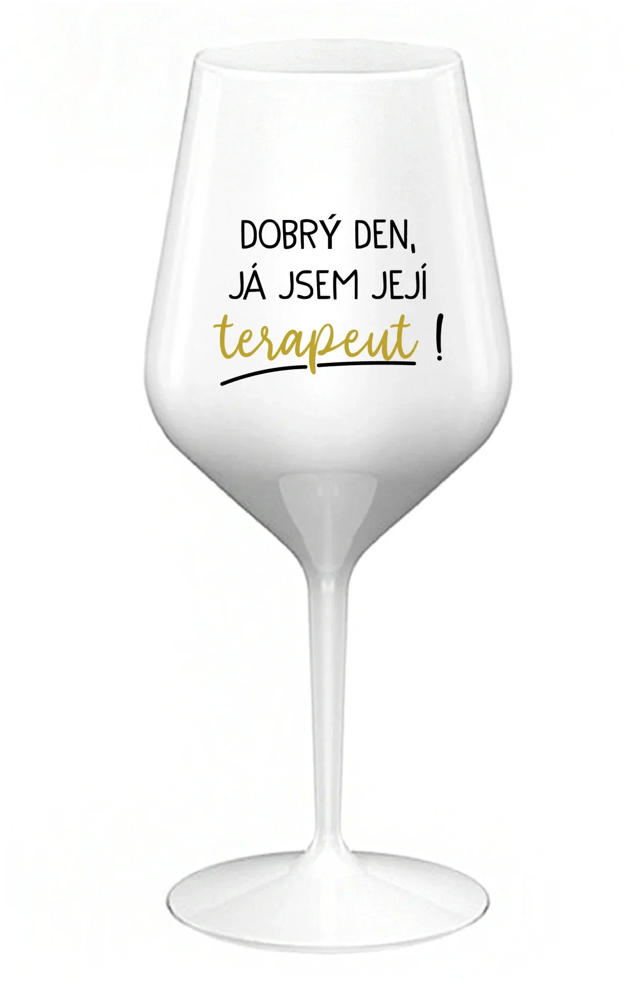 DOBRÝ DEN, JÁ JSEM JEJÍ TERAPEUT! - bílá nerozbitná sklenice na víno 470 ml