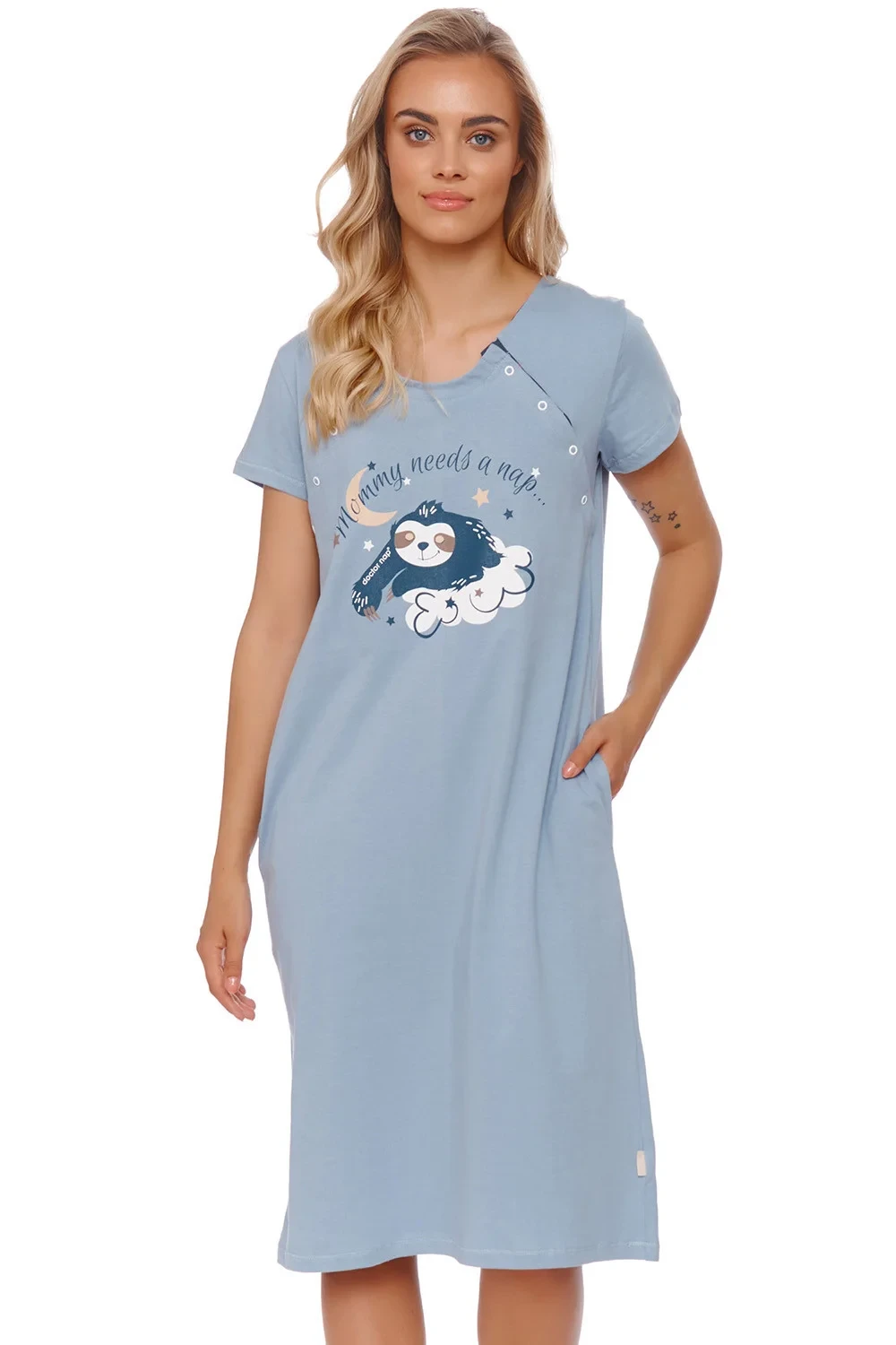 Noční košile značky Doctor Nap. model TCB.9992. výrobek je vyroben ze 100% bavlny. těhotenské oblečení. má kapsy. noční košile se zapíná na patentky. délka rukávů: krátké. dámský výrobek. typ výstřihu: kulatý.