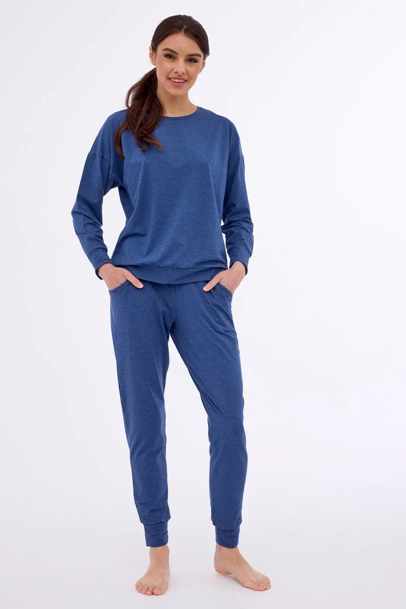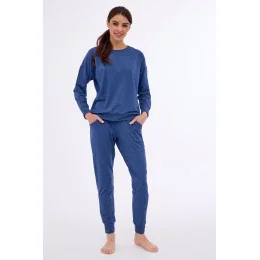 Dámská tepláková souprava z melanžového úpletu s dlouhými rukávy a dlouhými nohavicemi s kapsami. výstřih, manžety a spodní část nohavice košile zakončené pohodlnou šňůrkou.