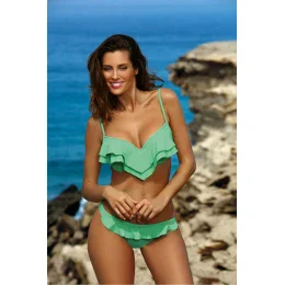 Jemné, velmi ženské dvoudílné plavky s okouzlujícími volánky: Matylda M-469.Tyto plavky vám propůjčí výjimečný šarm (a navíc vám umožní zapomenout na případné komplexy). Má skvělý střih. Byl vyroben pro malé a střední poprsí - dobře sbírá, tvaruje a zvedá prsa a výrazně je zvětšuje. Výstřih získá půvab, sex-appeal a vy maximální ženskost. Její tajemství? - jsou košíčky vyztužené jemnou pěnou, s kosticemi a poměrně velkou push-up výplní, která je tentokrát umístěna trvale uvnitř podprsenky. Volánky ve výstřihu jsou jedním z hlavních trendů léta. Ramínka jsou nastavitelná a obvod se vzadu zavazuje. Doplňují je koketní kalhotky, rovněž s volánkem. Plavky jsou vyrobeny z krásné italské tkaniny Carvico a dodávají se v řadě atraktivních plážových barev. Vyberte si ji ve svém oblíbeném!